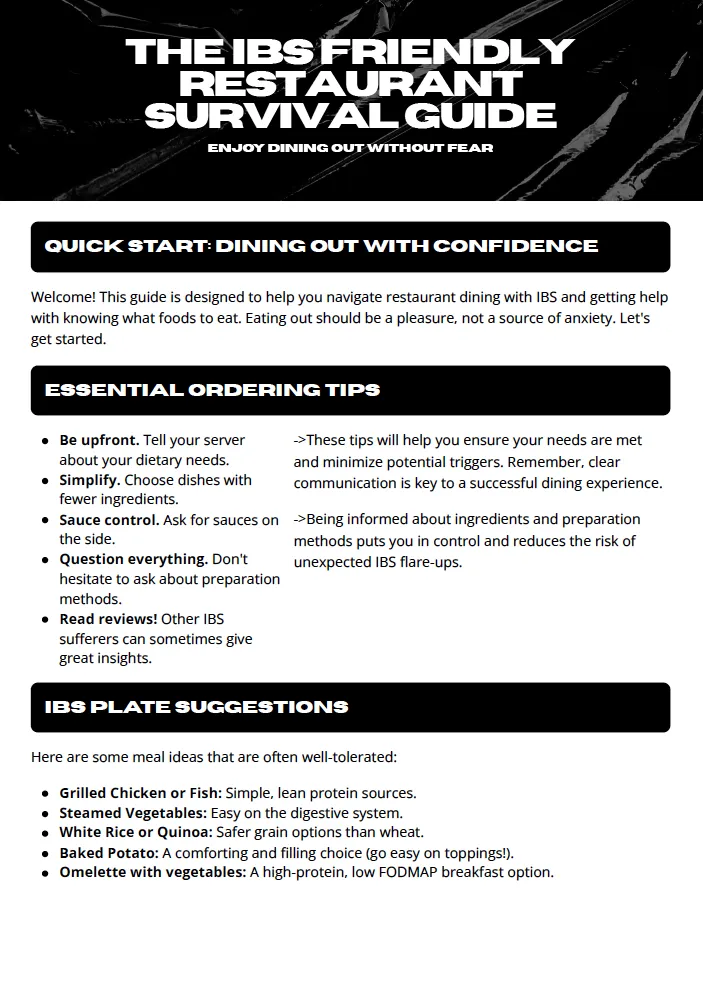The IBS Friendly Restaurant Survival Guide is a 3-page guide you can use before you order. In 60 seconds, you’ll know what to order—and how to ask for it and spot menu red flags fast.